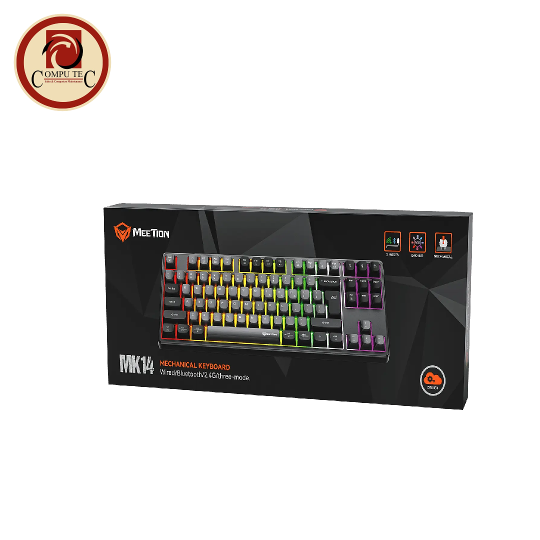 The Meetion MK14 Wireless RGB Gaming Keyboard is a compact TKL (80%) mechanical keyboard designed for gamers and professionals who want high performance while saving desk space. The 87-key tenkeyless layout removes the number pad to provide more room for mouse movement while keeping essential keys for gaming and productivity.